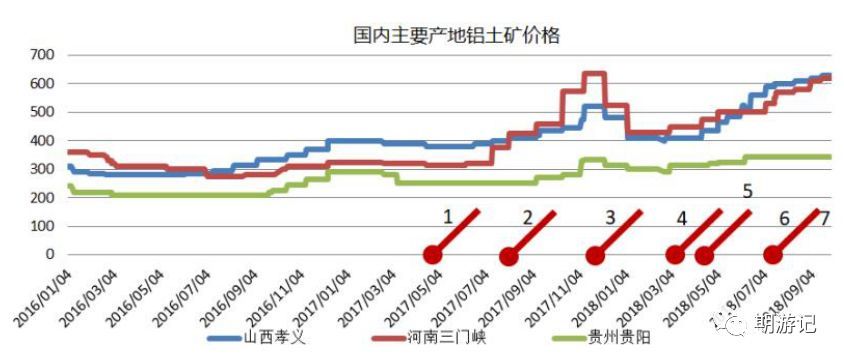 從上圖治理行動與礦石價格走勢可以看出,鋁土礦價格經歷了兩輪上漲,第一輪自2017年7月開始,受氧化鋁價格上漲和中央環保督查后部分治理行動下,鋁土礦價格主要受氧化鋁價格大幅上漲拉動;第二輪鋁土礦價格上漲自2018年3月開始,受山西省開展非煤礦山專項治理行動影響,鋁土礦無證、越層越界、變相開采等違法違規開采得到遏制,并保持執法高壓態勢,鋁土礦供應下降,價格持續上漲。我們從相關新聞中看到,今年5-6月份仍然有少量非法盜采鋁土礦資源舉報案例,但這次調研之后,當地貿易商介紹上述盜采行動已全部得到遏制,一旦發現將被定性為黑惡勢力,無論是地方政府還是當地礦商都不敢違法違規開采礦石,更不可能出現盜采情況。(注:在建筑工程、交運運輸、礦產資源、漁業捕撈等行業、領域,強攬工程、惡意競標、非法占地、濫開濫采等是本次掃黑除惡被司法機關定性黑惡勢力之一)