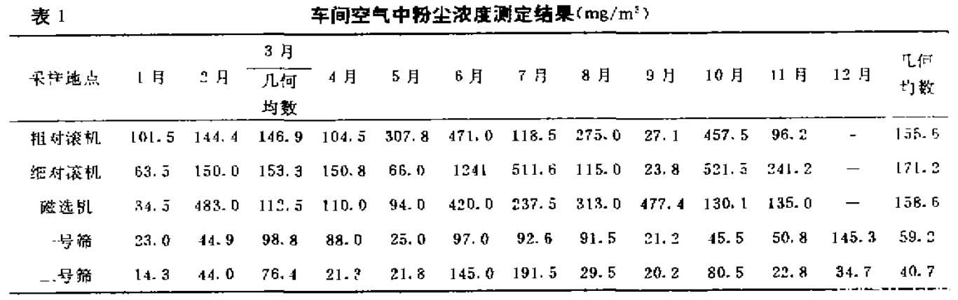 選五個(gè)測(cè)塵點(diǎn)。固定每月中旬測(cè)塵一次,共測(cè)12個(gè)月.其中三月份連續(xù)測(cè)4天,計(jì)算幾何均數(shù).結(jié)果見(jiàn)表1