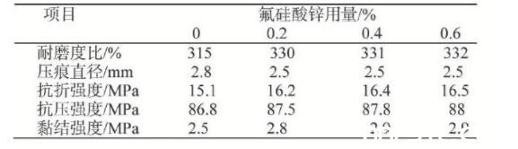 氟硅酸鋅主要對(duì)耐磨度比、壓痕直徑性能提升效果比較明顯, 對(duì)黏結(jié)強(qiáng)度的提升效果次之, 對(duì)抗壓抗折強(qiáng)度提升效果不怎么明顯, 最佳用量為占膠凝材料總量0.2%比較合適。