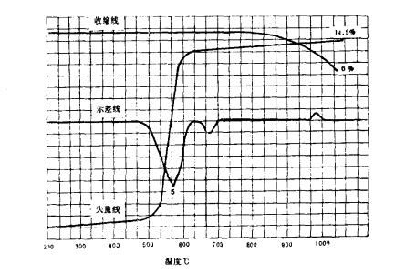 綜合熱潛圖有三條特性曲線,即差熱線,失重線,收縮線。差熱線由差熱分析法得出的,差熱分析是用一種沒有放熱和吸熱反應的材料(稱為中性體)與有熱效應的材料作溫升比較。中性體在加熱過程中溫度是持續上升的,溫度是時間的線性函數。有熱效應的材料當有吸熱效應時,與中性體出現了溫差,溫升滯后,在這個溫度區間形成一個吸熱峰:如果是放熱反應,材料溫度將高于中性體。于是出現了一個放熱峰。放熱峰說明是有晶體轉變,或者是有析晶現象,吸熱峰除了晶體的變異外,還有晶體的失水過程。